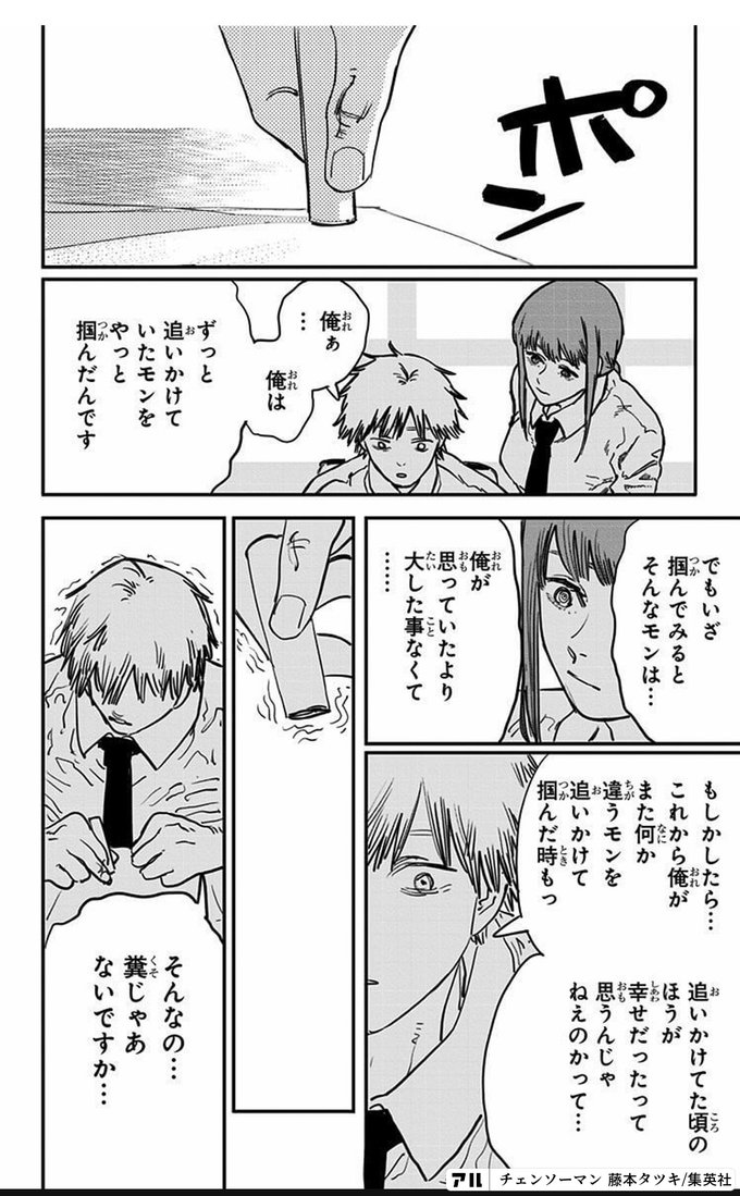 ポン 俺ぁ 俺は ずっと追いかけていたモンを やっと掴んだんです でもいざ掴んでみると そんなモンは 俺が思っていたより 大した事なくて もしかしたら これから俺が また何か違うモンを 追いかけて掴んだ時もっ 追いかけてた頃のほうが 幸せだったって思うんじゃ